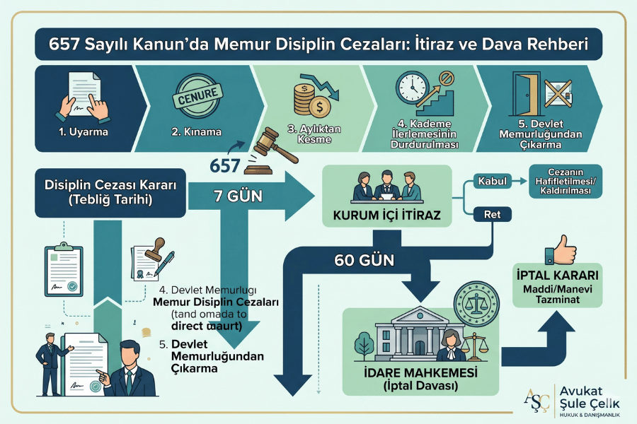 Avukat Şule Çelik Hukuk ve Danışmanlık Bürosu olarak hazırladığımız bu yazıda; 657 sayılı Devlet Memurları Kanunu (DMK) uyarınca düzenlenen disiplin cezalarını, bu cezalara karşı idari itiraz yollarını ve idari yargıda açılacak iptal davası süreçlerini hukuki boyutuyla ele alacağız.